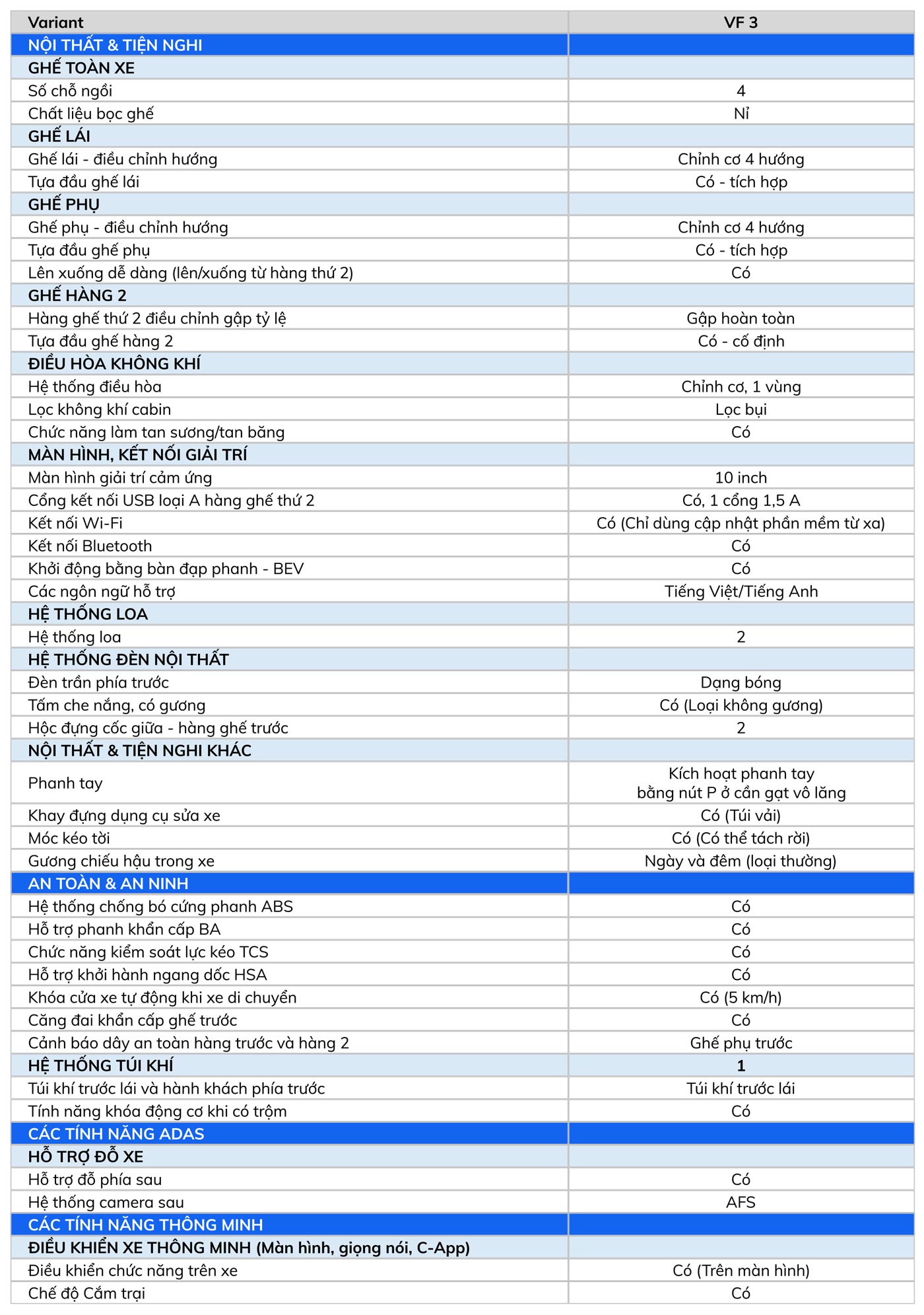 Bảng thông sô kỹ thuật xe ô tô VinFast VF 3.