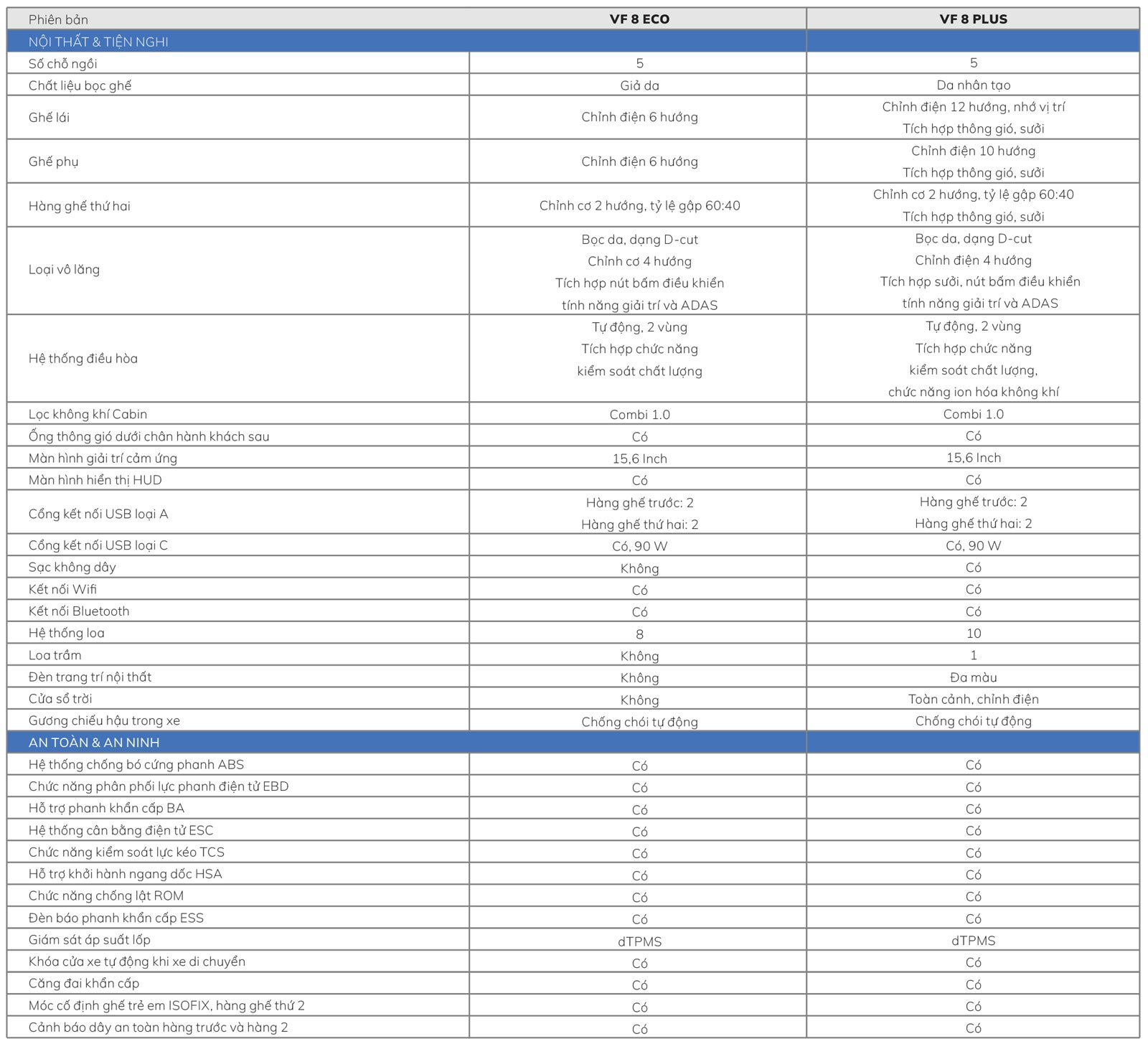 VinFast VF 8 với thiết kế mới sang trọng và công nghệ vượt trội. Với nhiều điểm nổi bật: ngoại thất nhiều màu, công nghệ trợ lý ảo Vivi 2.0 mới, ADAS và VF Connect. VinFast VF 8 có hai tùy chọn là phiên bản VF 8 Eco và phiên bản VF 8 Plus, trong đó phiên bản VF 8 Eco được trang bị động cơ điện có công suất 350 mã lực, đi được quãng đường 562km/lần sạc đầy, trong khi phiên bản VF 8 Plus có sức mạnh lên tới 402 mã lực, đi được quãng đường 457km/lần sạc đầy.